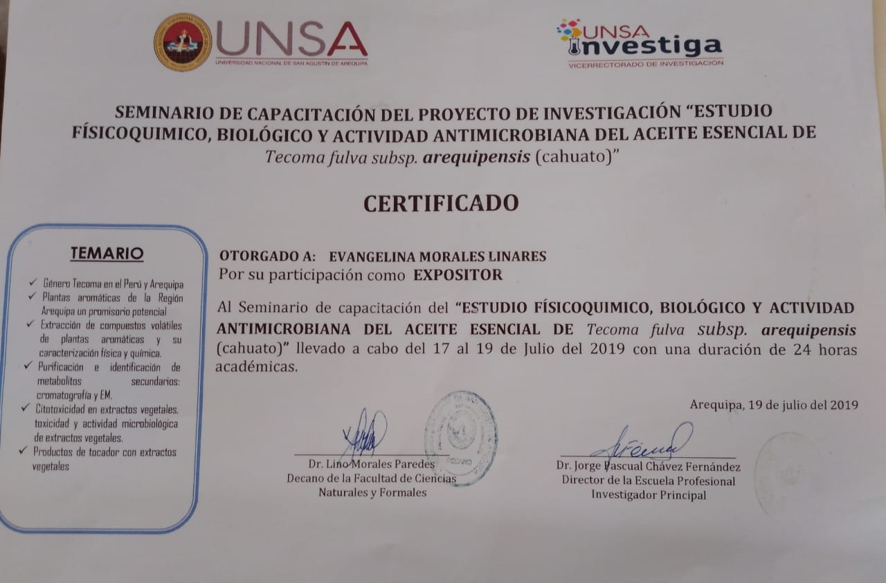 Gracias al apoyo de personas como la Dr. Eliana Vargas de la Universidad Nacional De San Agustín, de la Facultad de Química Orgánica.